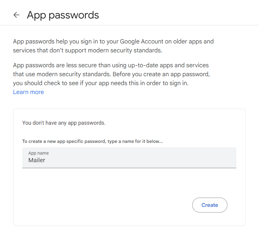 Once you access the page, you’ll be served a tiny form to generate app passwords of your account.