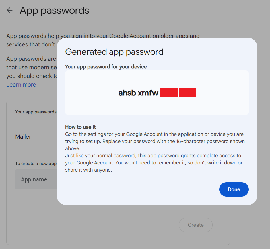 Password: "generated_app_password", // change with your trimmed generated app password earlier