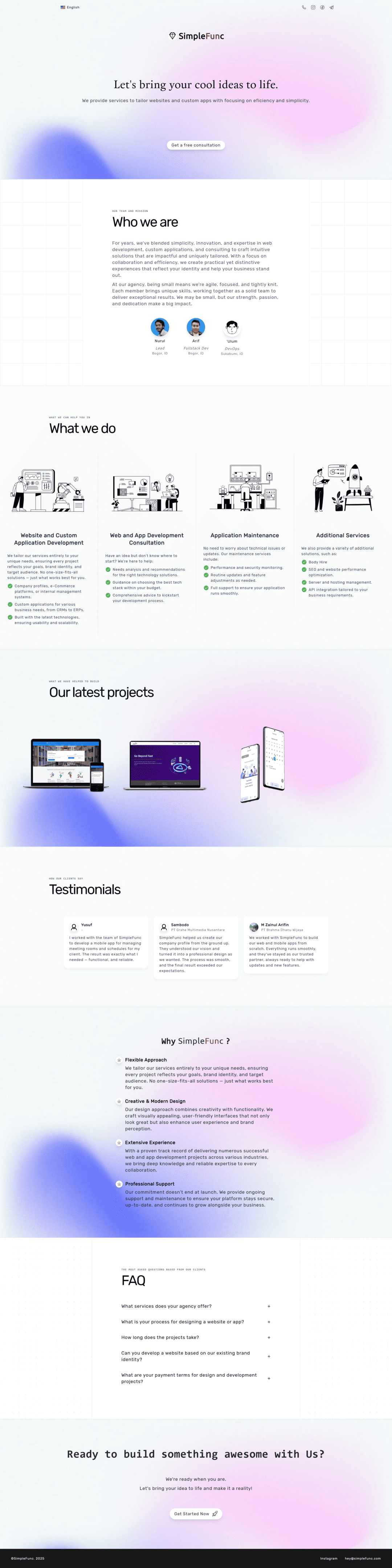 SimpleFunc is a digital agency dedicated to bringing ideas to life through tailored websites and custom applications. With a focus on efficiency and simplicity, the agency blends innovation and expertise to craft intuitive solutions that are impactful and uniquely tailored to each client’s identity.